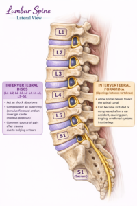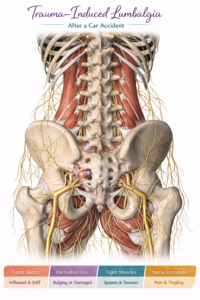When someone experiences a car accident, the body is exposed to rapid acceleration–deceleration forces. Even when the impact happens at the front or side of the vehicle, the force travels through the spine, often concentrating at the lumbosacral junction (L5–S1) — the place where the flexible lumbar spine meets the stable sacrum.